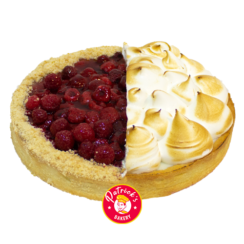 Kuchen de frambuesas enteras sobre un suave relleno de crema pastelera y además relleno con crema de limón natural con leche condensada decorado con merengue italiano sobre una base de galleta,. Para 8 a 10 personas.