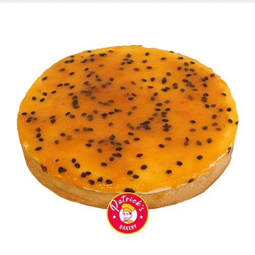 Kuchen de maracuyá con leche condensada y salsa de maracuyá sobre una base de galleta. Rendimiento 10 porciones.