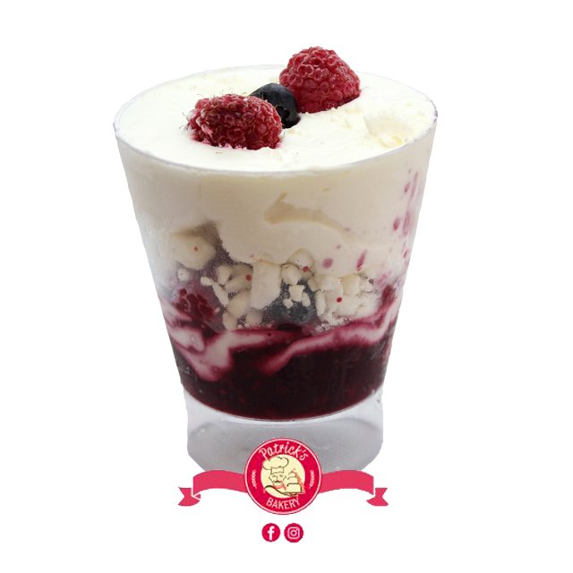 Postre con crema a base de Queso Philadelphia, crema chantily, acompañada de una salsa de Berries, trocitos de merengue y berries naturales.