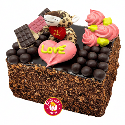Esponjoso bizcocho de chocolate, relleno con crema de chocolate, manjar y chips de chocolate, cubierto con crema de chocolate y baño de chocolate.