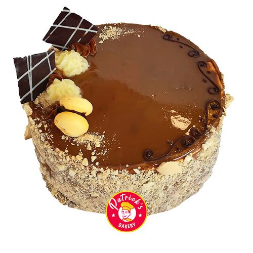Capas de hojarasca rellenas con manjar y crema pastelera, cubierta con manjar y trocitos de hojarasca.