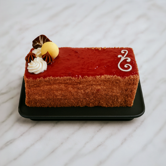 Esponjoso bizcocho de vainilla, relleno con crema chantilly, trozos de Frambuesas naturales y manjar. Tamaño rectangular para 10 personas.